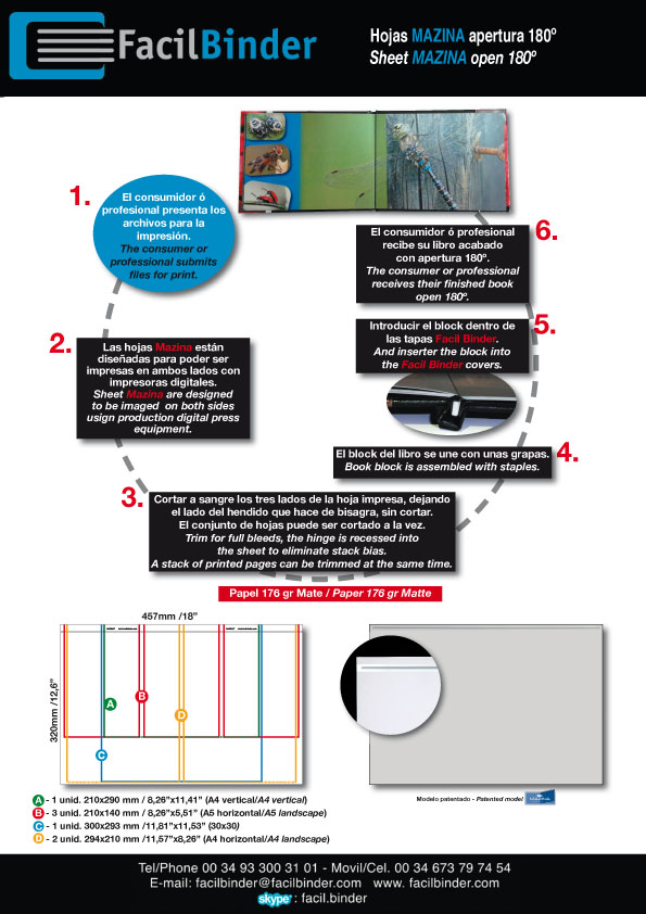 Las hojas MAZINA son unas hojas preparadas para imprimir en impresoras digitales (toner) y con una bisagra flexible que una vez impresas nos permiten la apertura de 180º dando una gran calidad y un perfecto complemento de las tapas FACIL BINDER.